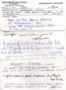 The individual image that the member has inserted then travels through the circuit and is continually examined and commented upon by the other members within the folio (see example of comment card at right). Upon return, the participant removes his/her image and replaces it with a new entry. The member also has the opportunity to vote for their favorite images. (Points are given for 1st, 2nd and 3rd place. Yearly results are reported to the members by the folio secretary and are also highlighted in Stereo World.) The folio then continues its endless travels around the circuit once again. Many long distance friendships have formed over the years among folio members.
